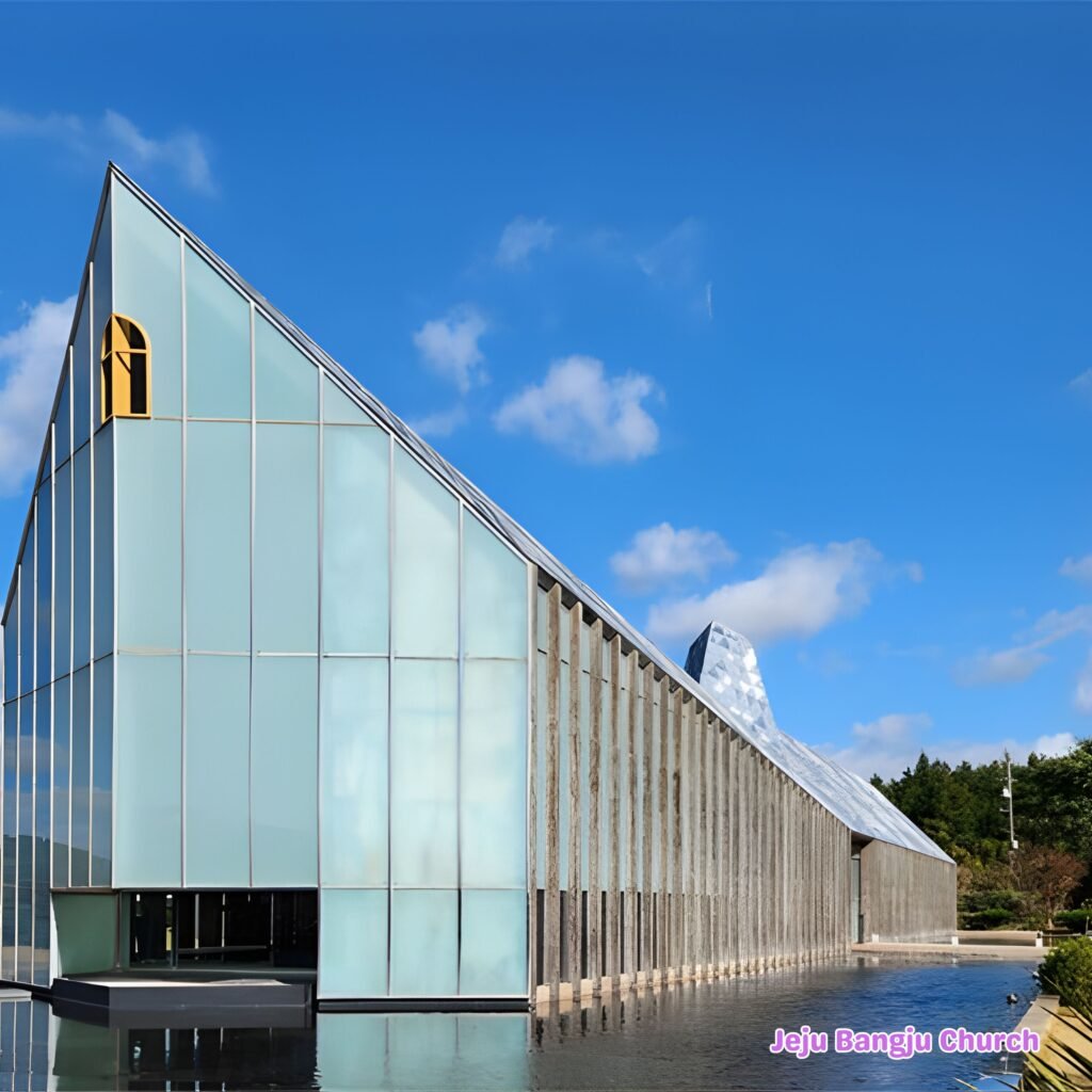 Bangju Church Bangju Church, designed by architect Itami Jun, is an architectural artwork. The unique design resembling a boat floating on water and the metal roof that changes with the angle of light shine even more mysteriously in winter’s cold light.